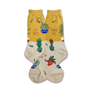 Life SUCCS! Things SUCC!... But these socks are still worth every PRICK! A fun, funky pair of crew socks that shout out your love for those tough little plants that brighten up your life. Great for anyone who loves succulent plants, puns, and trendy fashion. Also a great conversation starter!