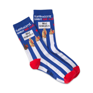 Strike your style chords with these women's Suffragette Spirit socks. Made with a blue background, white stripes, red toes and heels, and the words "Suffragette Spirit 1928-2018 New Generation," these socks are designed to inspire. They feature two hands, one black and one white, doing a fist bump, symbolizing unity and strength. Rock these crew socks to your next protest or rally and let your feet do the talking!