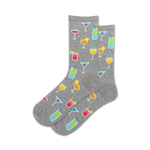 Slip into Summer Cocktails Novelty Crew Socks and prepare to say cheers! with every step! These gray crew socks for women are garnished with a colorful array of cocktails, from martinis to margaritas. Just think of all the 'toasts' you can make while wearing these fun socks made with a durable cotton blend to keep your feet feeling fabulous.