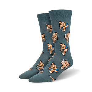 Sumo Slam Novelty Crew Socks: Sumo Slam novelty crew socks are like a sumo-sized helping of fun for your feet! Picture this: gray socks adorned with a pattern of sumo wrestlers in blue mawashi loincloths, ready to wrestle their way into your heart. Whether you're a sumo fan, a lover of all things Japanese, or just someone who appreciates a good pun, these socks are sure to bring a smile to your face. Plus, they're made for men, so you can show off your sumo style in comfort.
