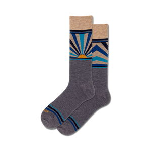 The sun is rising in style on these sunrise socks. And even when the sun has set, you'll still be glowing with these crew-length socks and their unique yellow, blue, and orange sunrise pattern. They say life is better on the sunny side, so rise and shine and slip into these gray socks today!