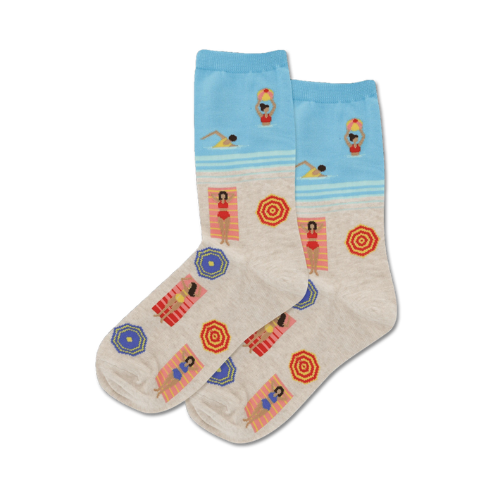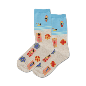 Sunbathers Crew Socks: Get ready to dive into a beachy paradise with our Sunbathers Crew Socks! Splash into the vibrant blue waters and lounge on the soft, light gray sands of our sock beach. Watch as the lovely ladies sunbathe, swim, and frolic playfully with a vibrant beach ball. Slip into these socks, and feel the summer sun kiss your feet.
