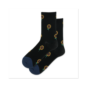 Beams of sunshine? Check! Endless petal power? You got it! Our crew-length Sunflower Wool socks show off a vibrant sunflower pattern on a black background, accented with blue toes and heels. These women's socks are as cozy as they are cute, ready to bloom all day long. Brighten up gloomy days and walk on the wild side ”in sunflowers!