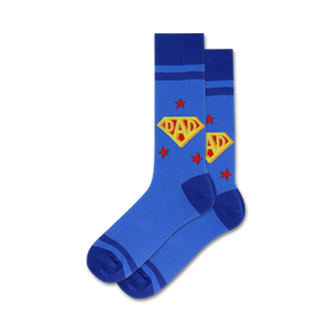 Dads are super, just like these socks! With a bright blue background, yellow diamond, bold red text that says "DAD", and a scattering of red stars. These crew socks for men are the perfect way to celebrate Father's Day. When your dad puts on his Super Dad socks, he'll feel like he can conquer the world.