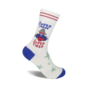 Kick off your day with a dose of super mom energy and a touch of humor with our 'Super Mom Super Tired' novelty socks. These socks will make you laugh and relate, featuring a vibrant illustration of a super mom in a cape and mask, holding a coffee cup while rocking the super tired look. With its bright colors and playful design, these white socks, with blue toe, heel, and top, and red and white striped cuff, are the perfect addition to your everyday wardrobe. Slip into these comfy crew length socks for women and let your feet do the talking. Show off your super mom status with a dash of humor, reminding yourself and others that even superheroes need a break.