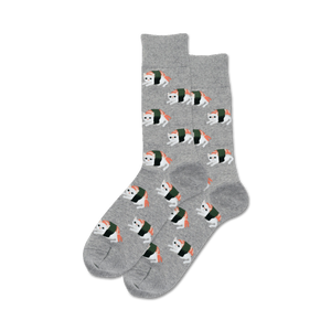 Pair of grey crew socks featuring a repeating pattern of adorable cats disguised as sushi rolls. }}