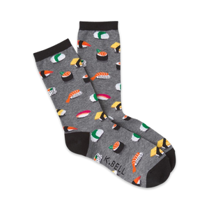 Sushi Socks: Dig In! These crew socks in gray feature a delectable array of sushi favorites, including nigiri, maki, and sashimi. Crafted from soft cotton, with a black toe and heel for an extra dash of style, these socks are the perfect feast for your feet. Fun fact: Did you know that sushi was once considered a fast food in Japan?