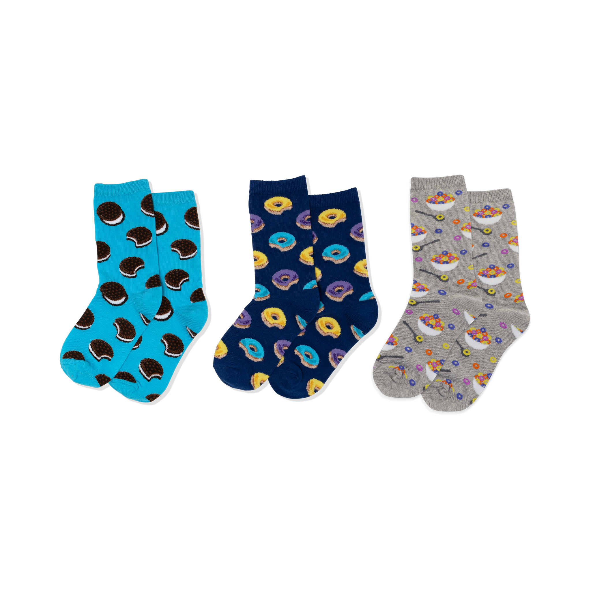 A little dessert for your drawers, this crew sock 3-pack brings three different sweet-tooth patterns into one easy rotation. One pair is dotted with chocolate sandwich cookies, another with colorful frosted donuts, and the third mixes bowls of candy and cereal-like treats for a playful pantry-meets-candy-shop look. The result is cheerful without being fussy, with enough variety to keep things interesting all week.