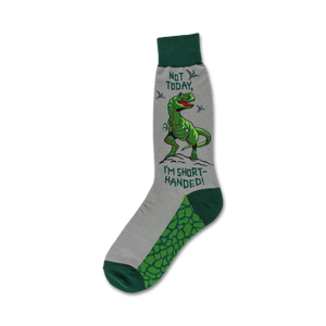 These aren't just socks, they're a prehistoric party for your feet! Picture this: a ferocious T-Rex, armed with the slogan "Not today, I'm short-handed!" These gray kicks, with their green toes, heels, and cuffs, are a hilarious reminder that even dinosaurs had to deal with a shortage of hands. Step into a pair and channel your inner T-Rex just don't try to eat your socks!