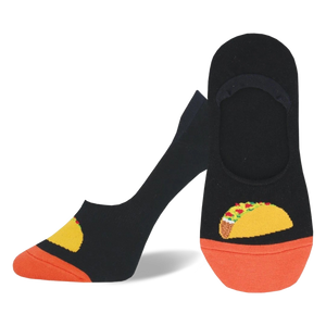 Taco Toesday! Our funky black socks are spiced up with bright orange toes and heels, and a pattern of delicious tacos in orange, yellow, red, and green. Wear these liner socks to spice up your style and add a little fun to your feet.