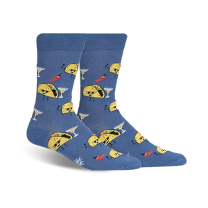 Taco Tuesday Crew Socks for Men: Tacos, margaritas, and chili peppers with faces and fun patterns - perfect for Taco Tuesday or any time you need a fiesta on your feet!