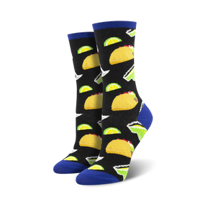 Who says tacos and margaritas are just for Tuesday nights? With these black socks, your feet can enjoy the fiesta every day! Tacos, with their yellow shells, green lettuce, and red tomatoes dance alongside frosty green margaritas with lime wedges. Your feet will be wishing it was Taco Tuesday every day as you strut around in these spicy socks! P.S. No calories!