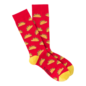 Feast your peepers on the most delish socks ever conceived - our Taco Crew Socks! Picture this: a sizzling red backdrop adorned with an army of tacos, each boasting a vibrant yellow filling of lettuce, tomatoes, and cheese. Top it all off with a sunny yellow cuff, and you've got a recipe for foot fashion that'll make your taste buds dance. Who says tacos are just for Tuesdays? Don these bad boys, and every day can be Taco Tuesday!