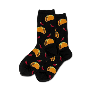 Spice up your footwear game with our Taco socks! These black crew socks feature an all-over pattern of delicious tacos and fiery red chili peppers. Show off your love for Mexican food, taco trucks, or just let everyone know you're always hungry. These socks are perfect for taco Tuesdays, parties, or making a statement at the office. They're also a great conversation starter. Warning: Wearing these socks may cause increased taco cravings.