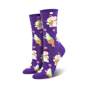 Meow-tastic Adventure: Dive into a vibrant, cute, and cool world with Taiyaki Cat Socks! Featuring an adorable purple canvas of cartoon cats, irresistible ice cream, and tempting fish-shaped waffles, these crew-length socks are perfect for women with a playful paw-sitivity. Slip into these charpurr-ming socks and unleash your inner feline finesse!