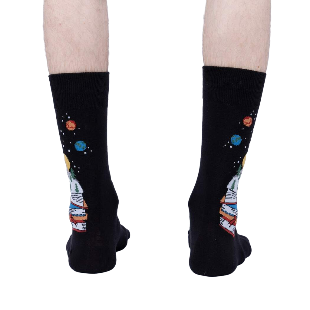 Take a look at these black crew socks for men with a "Take a Look It's in a Book" design. Get lost in a world of art and literature while you rock these socks featuring books with mountains, trees, stars, and planets inside. Perfect for the bookworms, students, teachers, art enthusiasts, and anyone who loves a good story.