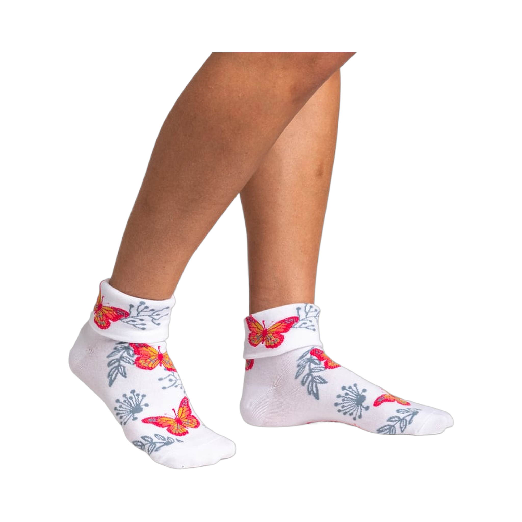 Butterflies, leaves, and a turned cuff give these women's crew socks a look that feels both delicate and deliberate. The pattern has movement built into it, with bright butterflies floating across the foot and ankle while the cuff adds a little structure and a little surprise. They have the kind of detail that makes you look down twice, partly because the design is charming and partly because the cuff changes the silhouette in a neat, easy way.