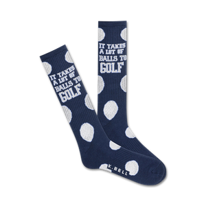 Do these socks golf ya crazy? These blue and white polka-dotted socks make it loud and clear that it "Takes Balls to Golf." If you dare to wear these bad boys, be sure to tee off on the course with your clubs in tow. What can we say? It takes a man with big balls to show up in socks like these. What are you waiting for? Stop caddying around and step up to the tee box. We're looking forward to seeing you hit a hole in one while sporting these awesome new golf socks. Ready to go down in birdie history? Suit up with these socks. Fore!!!