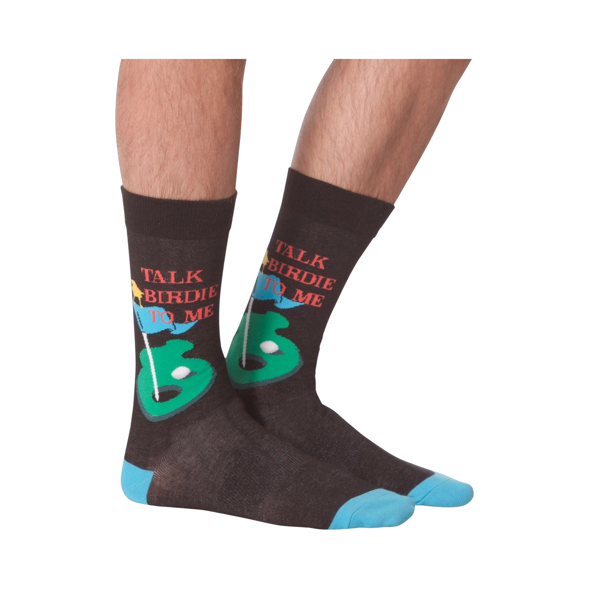 Talk Birdie To Me: Swing your way into a hole-in-one style with these funky golf socks. Featuring a cartoonish birdie on a green putting surface, these socks will have you putting better than Tiger Woods. Made for the course, these black crew socks, with their blue toe and heel, are a hole-in-one gift for the avid golfer in your life, or a sweet treat for your own stylish feet!