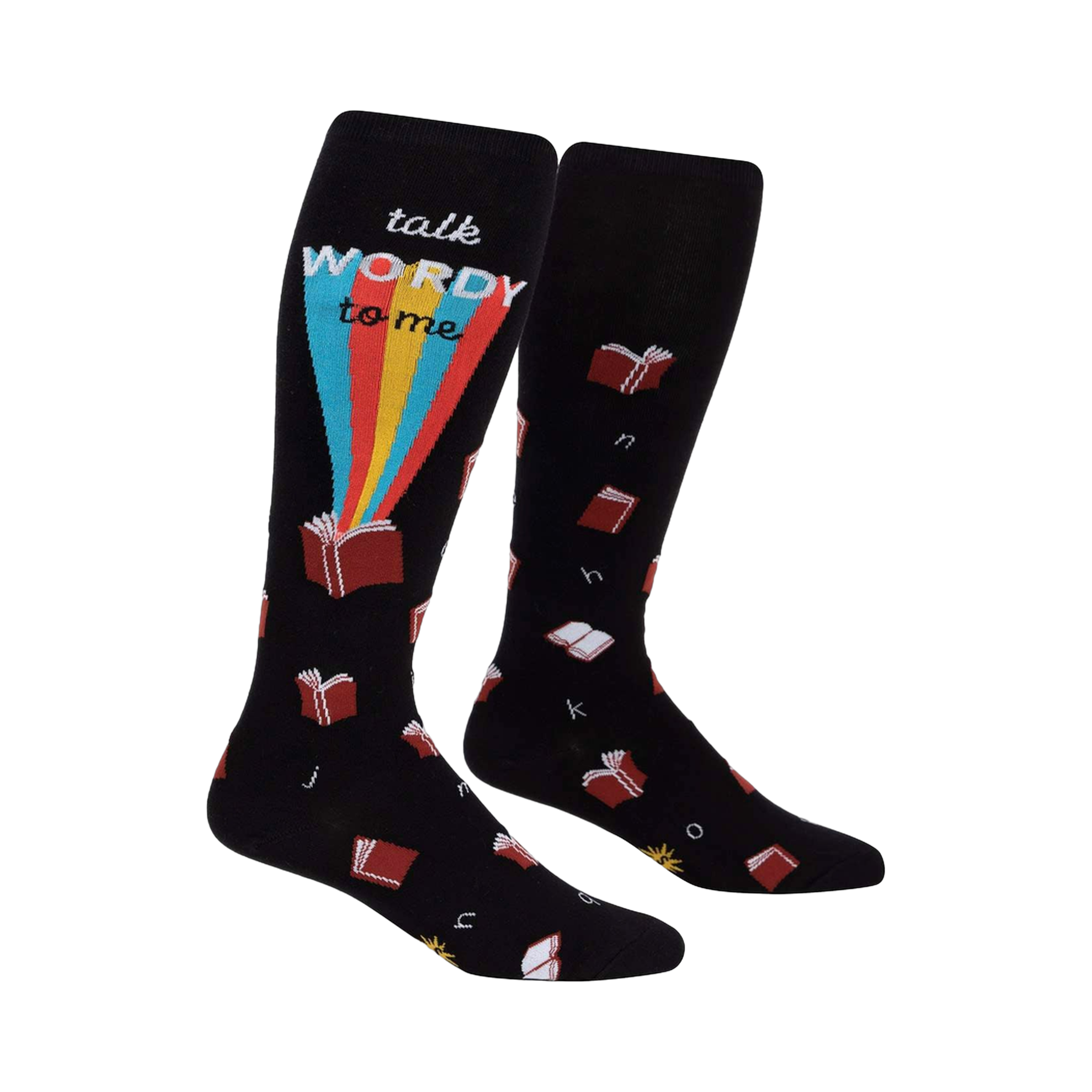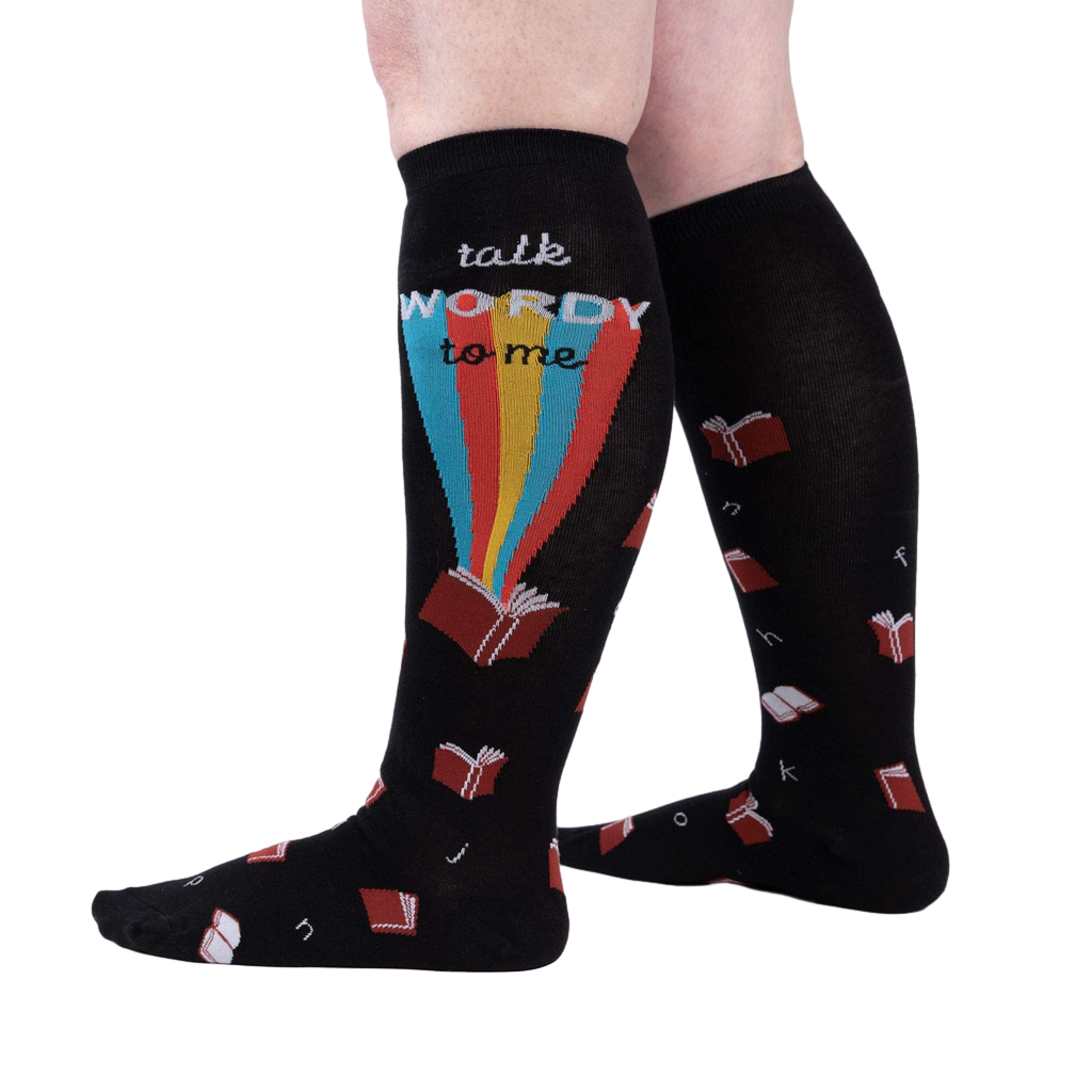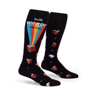 These knee-high socks are black with a fun design. The main graphic says 'talk WORDY to me' with a rainbow-colored ray of light emanating from an open book. Smaller, scattered images of books and letters are printed on the socks. They're comfy-looking, and the colors are bold but not overwhelming. Pretty much the perfect socks for book lovers or anyone who appreciates a bit of wordplay.