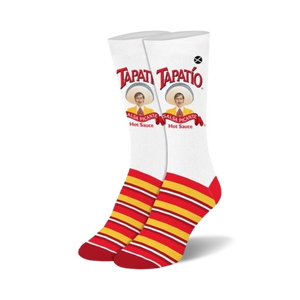 If socks could talk, these Tapatio socks would be saying "Hola!" in their bold red and yellow stripes. Picture this: a crew-length sock staring back at you with the iconic sombrero-wearing man from the Tapatio hot sauce label plastered on the front. These socks are the life of the party and the perfect way to add a dash of spice to your everyday wardrobe ”just like a dash of Tapatio adds flavor to your favorite dishes!