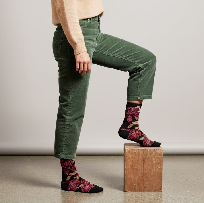 Enter the Tapestry Floral Sock, a botanical dream garden blooming on your feet! With crimson red roses, fuchsia pink camellias, and emerald green leaves dancing across a black background, these crew socks are a vibrant burst of beauty. Step into a world of color and let your toes bask in the glory of these exquisite blooms.