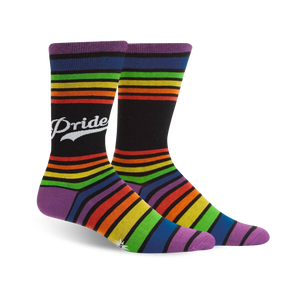 Represent your pride in these crew length socks with the word PRIDE written vertically down one side. These socks feature a rainbow of horizontal stripes and are a fun and festive way to show your support for the LGBTQ+ community. Whether you're hitting the town or lounging at home, these socks say pride loud and proud.