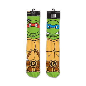 Cowabunga! Gear up for a radical adventure with our Teenage Mutant Ninja Turtles Retro Crew Socks. Join Raphael and Leonardo as they take you on a nostalgic journey through the sewers of New York City. Whether you're a fan of the original cartoon, the live-action movies, or just love kickin' it old school, these socks are sure to make you feel like a hero in a half-shell. Available in the classic black, green, orange, red, and yellow, these crew socks are perfect for everyday wear or your next pizza party. Cowabunga, dude!