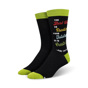 The future is bright with these novelty socks! Featuring a fun rainbow design with "The best way to predict your future is to create it - Abe Lincoln," these crew-length socks will inspire you to seize the day. With a resilient bamboo construction and a black design with green accents, these socks are perfect for the bold and creative.
