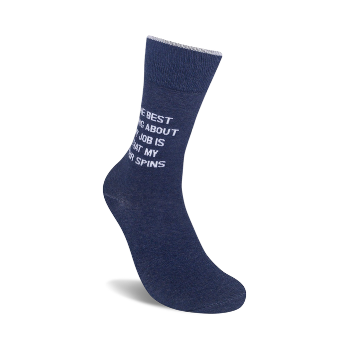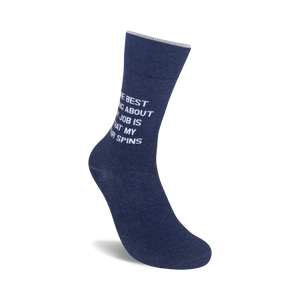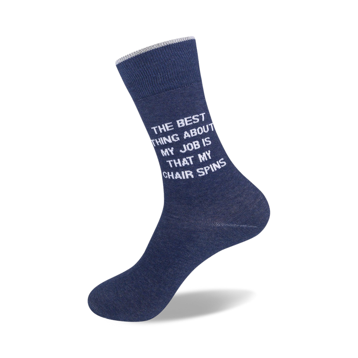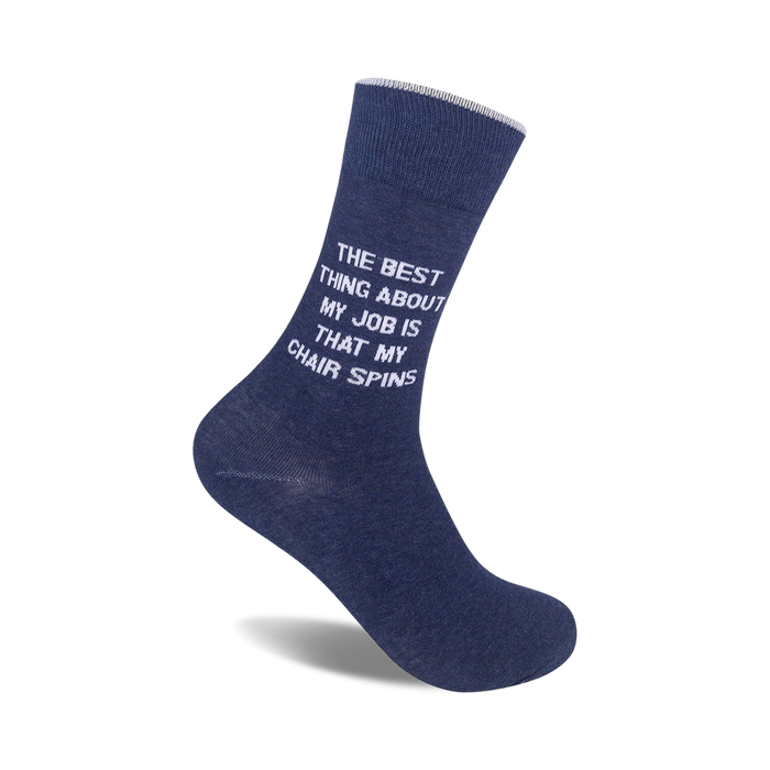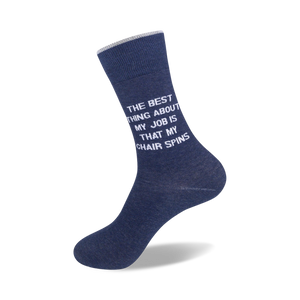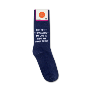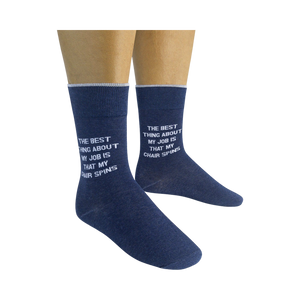 Slip into a pair of The Best Thing About My Job Is socks and let your feet do the talking! These sassy blue crew socks for men feature the hilarious phrase "The Best Thing About My Job Is That My Chair Spins" in bold white lettering. Whether you're at the office or lounging at home, these socks will bring a smile to your face and let everyone know that you're not taking life too seriously. Get ready to turn heads and start conversations wherever you go with these fun and unique socks.