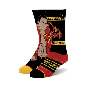 Grab a pair of The Great One socks and show off your love for The Rock in style! Whether you're a devoted fan or just appreciate a good pun, these socks will surely get a chuckle. The black socks feature a bold red and yellow pattern with a cartoon drawing of the iconic wrestler striking a pose. Made for both men and women, these crew length socks are ready to rock any occasion.