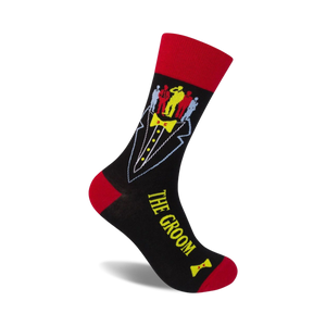 It's your wedding day and if your feet aren't wearing snazzy black tuxedo socks with a red bow tie and red trim, are you really a groom? These groom socks feature a pattern of 4 men in black suits with red ties and yellow stick figures of groomsmen. They're perfect for any groom who wants to add a little fun and personality to their wedding attire. Plus, if you're feeling a little nervous on your big day, they're sure to bring a smile to your face.