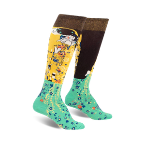 The Kiss socks pay homage to Gustav Klimt's famous painting, featuring a passionate kiss between a man and a woman. The knee-high socks for women are adorned with a mesmerizing array of gold, yellow, green, blue, and black that mimics the painting's iconic hues. Slip into a pair of these art-inspired socks and make a statement wherever you go. They're like tiny masterpieces for your feet!