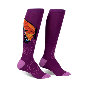 Flutter Into Fancy With The Monarch Step into a world of color and wonder with The Monarch butterfly knee-high socks. These socks are ready to take flight with their vibrant orange wings, black and blue markings, and a delicate pink and purple flower. These aren't your regular socks, they're a symbol of strength and resilience, just like the majestic monarch. Soar in style and show off your unique inner beauty, and watch heads turn as you walk by. Celebrate the beauty of nature and add some fun to your wardrobe. Get your Monarch socks today and embrace the power of transformation!