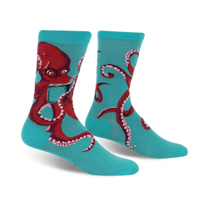 Octi-what?! These snazzy crew socks in turquoise feature an allover pattern of red octopuses wearing horn-rimmed glasses and reading a book. Perfect for the bookworm with tentacles, or anyone who appreciates a good pun. Bonus: octopuses have three hearts. How cool is that?