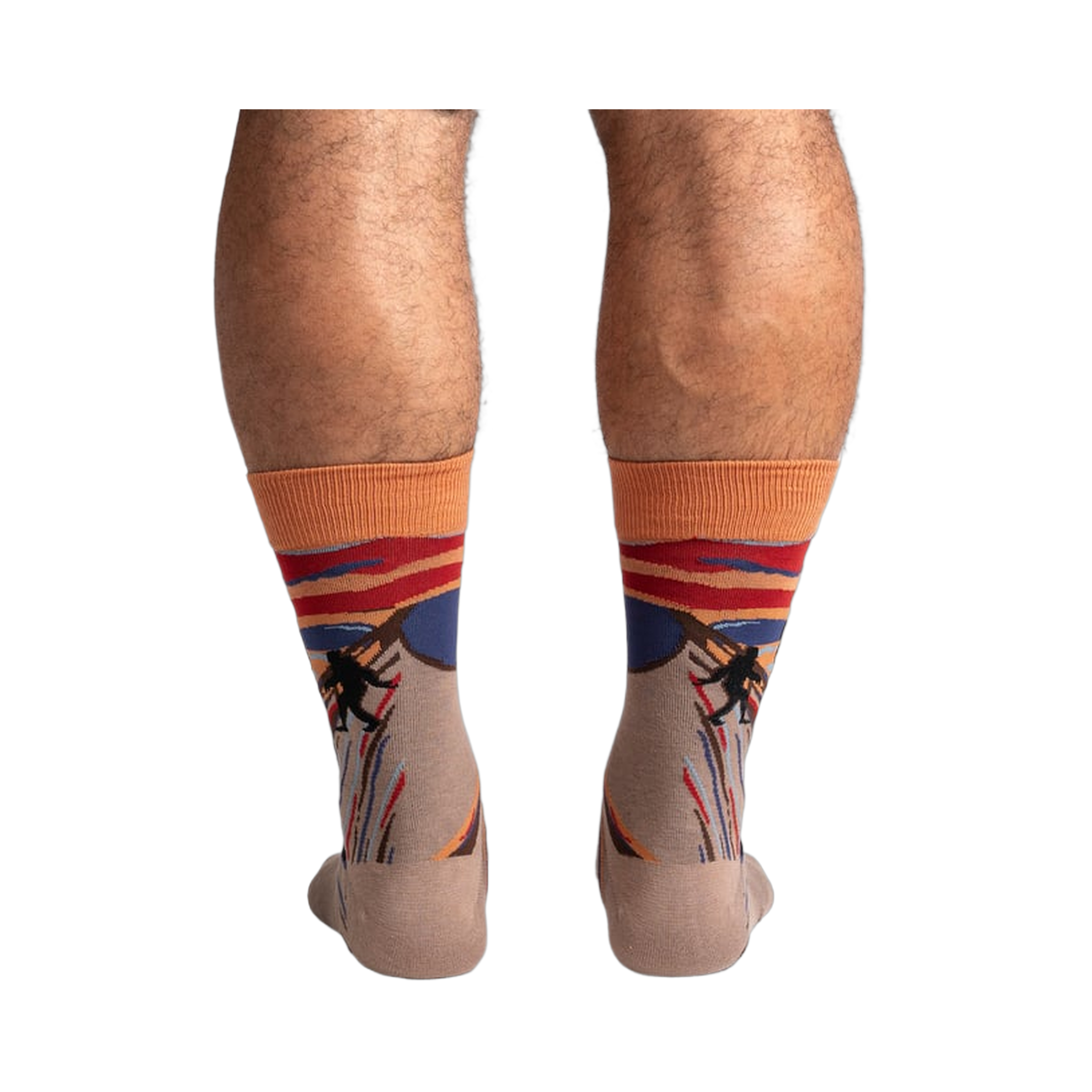 The Sasquatch Scream socks bring a campfire legend to life with a scene that feels part roadside mural, part mysterious wilderness story. A startled Bigfoot stands against a dramatic sunset sky, giving these men's crew socks a playful, slightly spooky personality without going overboard. The artwork has a hand-drawn look that makes the whole pair feel like a little roadside oddity you can wear.