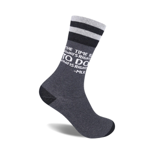 In a world where socks are gray and boring, The Time Is Always Right socks charge into the scene like a civil rights march. Inspired by Martin Luther King Jr.'s timeless words, these socks remind us that justice and equality are never out of season. The black and white striped cuffs add a touch of classic style, while the bold quote is a powerful reminder to do what's right, even when it's tough. Whether you're marching for justice or just marching to the office, these socks will keep you motivated and stylish.