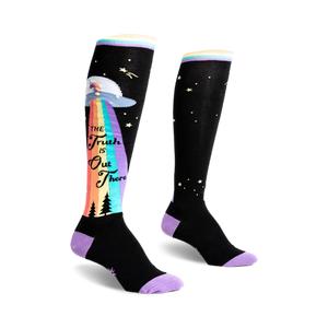 Ever felt like your daily routine could use a touch of cosmic whimsy? With every step, 'The Truth is Out There' socks transport you to a universe where rainbows and UFOs dance across the night sky. Embrace your inner seeker and let these vibrant knee-high socks spark conversations and curiosity. Whether you're traversing galaxies or just heading to the store, these socks promise to make every journey a little more stellar.