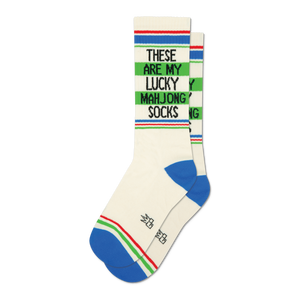 Rock these cream-colored socks for a bit of playful luck. They feature a clean, classic base with bold horizontal stripes - red, blue, and green - wrapping around the cuff. The main show is the large text running down the front: "THESE ARE MY LUCKY MAHJONG SOCKS," written in a vibrant green, slightly pixelated font with a dark outline. Down by the toe, there's a striking royal blue cap, accented just above it with slim red and green stripes. On the outer side, near the heel, a small black symbol adds a touch of detail. Grab these for your next game night or just whenever you need a bit of good fortune.