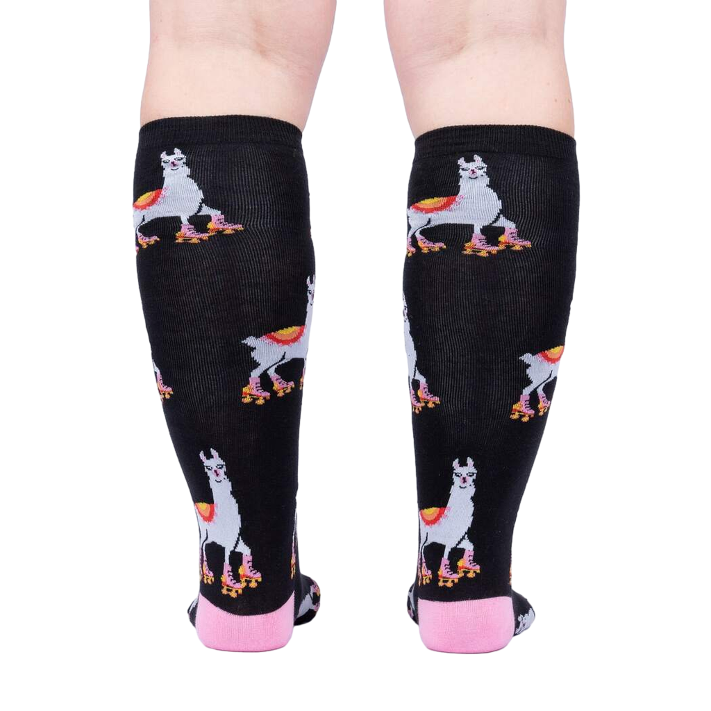 Hey, sock enthusiasts! Meet "They See Me Rollin'", the knee-high black socks designed exclusively for women with a quirky twist: A pattern of white llamas rockin' pink and yellow roller skates with vibrant yellow, red, and blue wheels! These socks are not just a fashion statement; they're a conversation starter. Who knew llamas could skate? You'll be the talk of the town, or at least your next sock-appreciation gathering. So, slip on a pair of "They See Me Rollin'" socks and let the skating llamas take you on a wild adventure with every step!