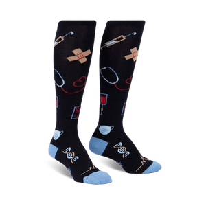 Thoracic Park Socks: These knee-high socks for women feature a playful pattern of medical instruments and symbols in black, blue, and white. With images of stethoscopes, syringes, bandages, and pills, they're perfect for anyone in the medical field or anyone who appreciates a punny twist on everyday items. They come with a blue toe and heel for an extra pop of color. Get a pair of Thoracic Park socks and show your love for all things medical!
