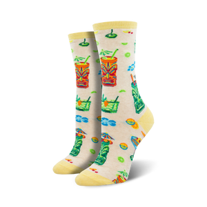 Tiki Drinks Crew Socks: Aloha! Grab a pair of these fun, tropical crew socks that are sure to transport you to a tropical paradise. With a lively pattern of colorful tiki drinks surrounded by lush leaves and flowers, these socks scream summer fun! No need to lei around, slip on these socks and get ready to party!