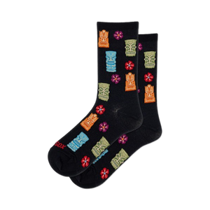 Tiki vibes, straight to your toes! These black crew socks for women sport a tropical pattern of multicolored tiki heads and flowers.