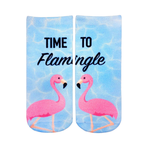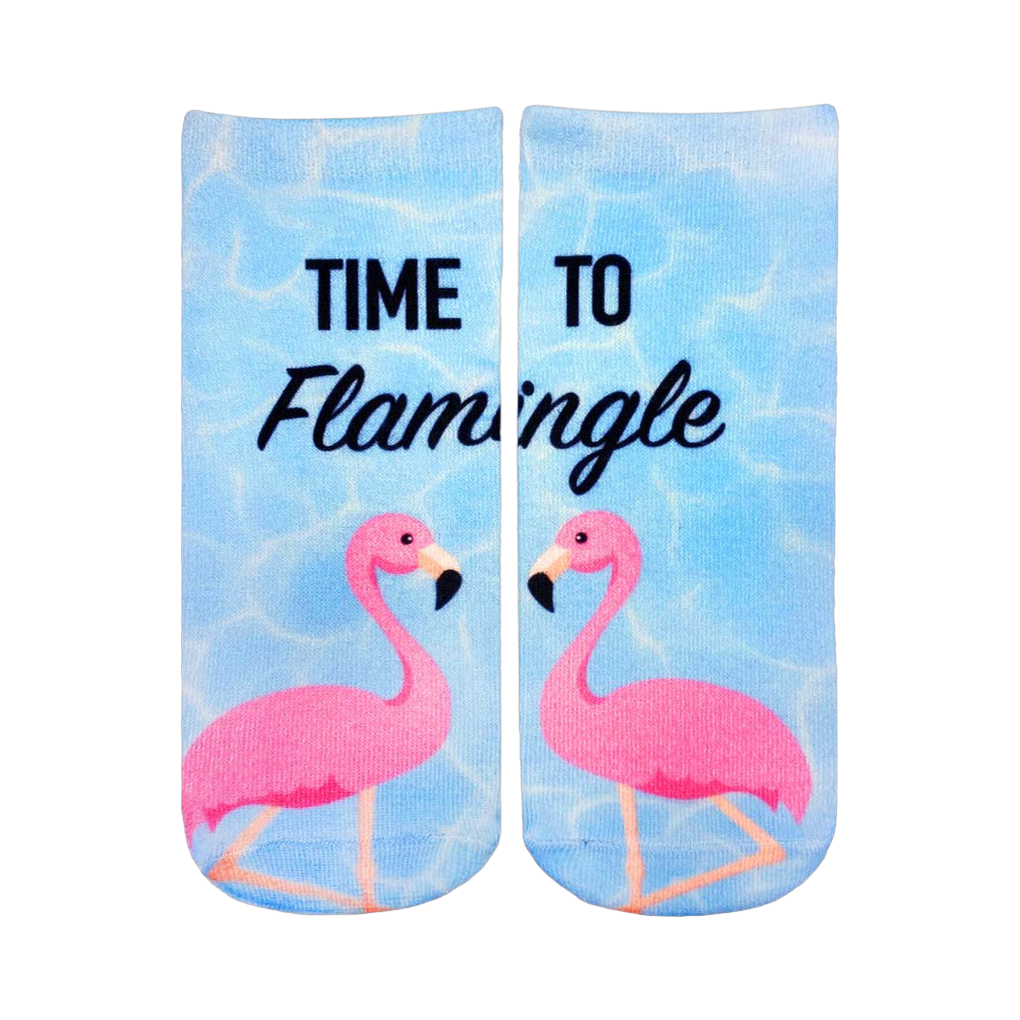 Calling all flamingo enthusiasts! Strut your stuff in style with our electrifying 'Time to Flamingle' socks. These socks will have you dancing in delight, with their vibrant pink and blue flamingo motif and playful "Time to Flamingle" message. Flaunt your fun-loving spirit and show everyone that flamingos aren't just for lawn ornaments. Get ready to flock to the checkout!