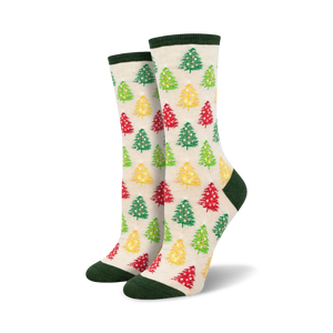 Tinsel Town will have you dressing to impress your mistle-toes! These tree-mendous women's crew socks are all set for a rocking around the Christmas tree party. Tis the sea-sun to spread holiday cheer with this holly jolly festive design reminiscent of Bing Crosby Christmas melodies. With candy cane colored Christmas trees as far as the eye can see and a cuff dark as the night sky on Christmas Eve, these socks are just what Santa ordered.