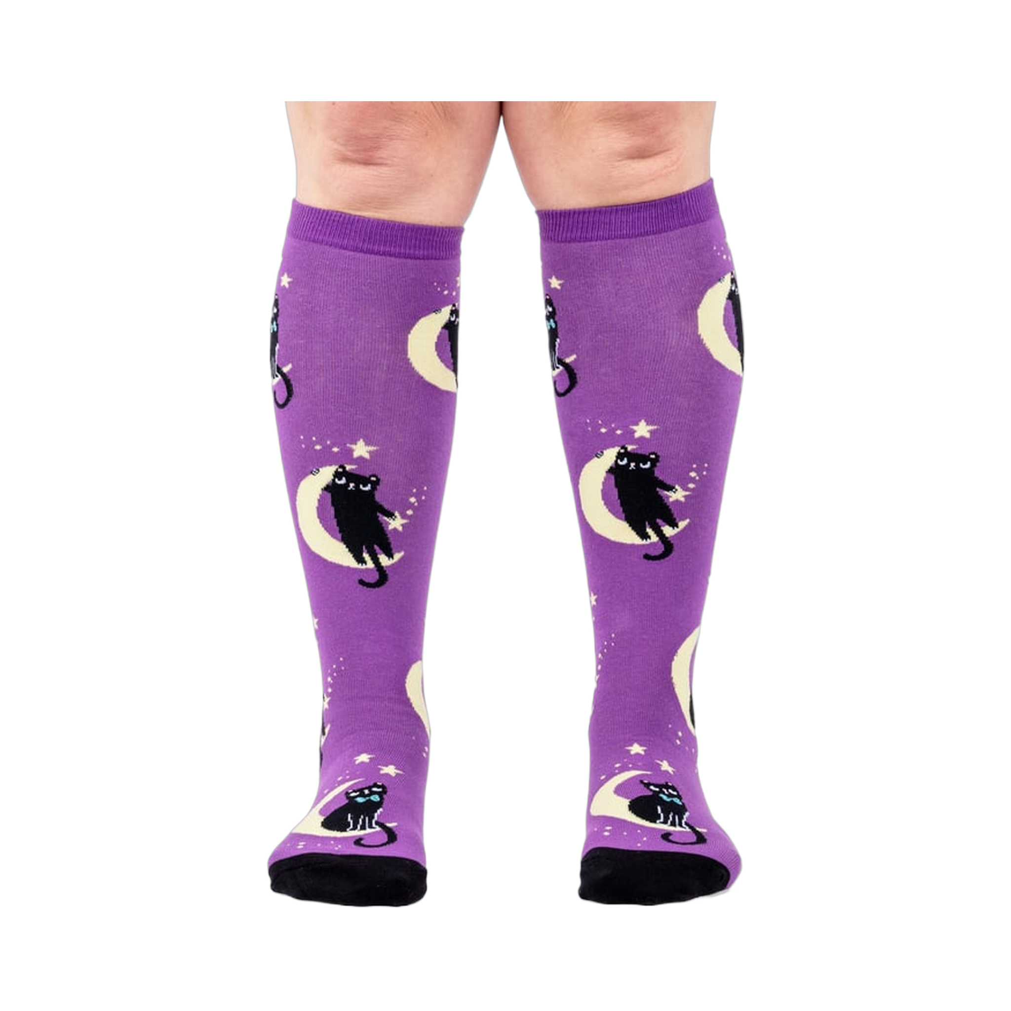 Ever notice how cats seem to know a secret or two about the universe? Our knee-high socks capture that enchanting feline mystery with a black cat perched playfully on a crescent moon. Whether you're striding down the street or lounging at home, these socks are your ticket to celestial charm. Wrap your feet in the magic of night skies and cosmic whispersbecause every step should have a touch of purr-fection.