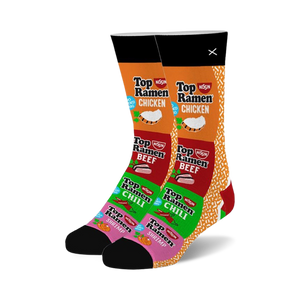 Get ready to make your footwear the star of the show with our stack of Top Ramen socks! Let the world know you're a connoisseur of flavor with this fun pattern emblazoned on black, comfy crew socks. We've got a serving for everyone with chicken, beef, chili, and shrimp options. Trust us; your kicks have never looked so delicious!