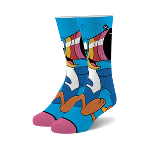Are you a fan of scrumptious cereal with a colorful bird mascot? Do you know Toucan Sam? If yes, then you'll cluck about these socks as if they were Froot Loops!! Toucan Sam Follow Your Nose Socks feature a funny bluebird with his signature bright beak and colorful crest, wearing a tropical lei and holding a bowl of delicious Froot Loops. These unisex crew socks are a sweet, fruity treat for your feet. Wear them for a colorful boost of happiness and nostalgia anytime.