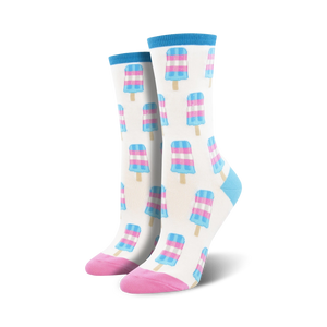 Fun Trans Pops Crew Socks: Step up your sock game with Trans Pops Crew Socks! These playful socks feature a bold pattern of popsicles in shades of pink, blue, and white, splashing across your feet like a rainbow. With pink toes and heels and blue cuffs, these socks are a sweet tribute to the LGBTQIA+ community. Grab a pair and flaunt your pride, one popsicle-print at a time!