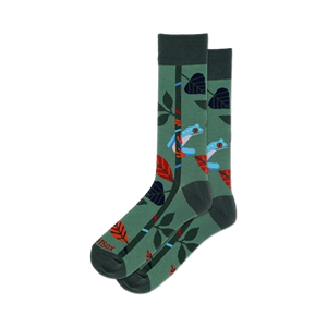 Tree Frog socks to leap into. These green socks hop with a pattern of blue and orange tree frogs with red eyes. Dark green vines intertwine with dark blue and green leaves. Frogtastic!